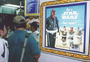 | TACO BELL TACO BELLではアナキン・スカイヲウォーカーのコップをゲット。看板にでかく出ているダース・モールのカップが欲しかったんだが。 「中身はいらん、入れ物だけくれ」と拙い英語で言ってるところ。 そういえば日本にはタコベルの店は無いと思ったが、日本でのキャンペーンはどうなるのか? |