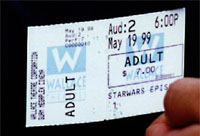 | 苦労して手に入れた公開初日のチケット。現地の旅行代理店に何度も国際電話して、「こんなオーダーははじめてだ」と言われながらようやく入手。定価は$7と安いのだが、スタッフに3時間も並んでもらったということで$25払いました。 もっとも午前0時からの世界で最初の一般公開のチケットはとれず、初日とはいえ午後6時。でも、グアムとアメリカ西海岸は17時間の時差があるので、ハリウッドの午前0時の上映に遅れること1時間で観ることができたわけだ。 |