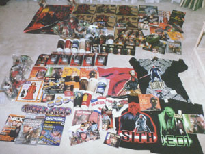 | 戦果 明日は日本に帰るという日の夜。みんなで買ったグッズをホテルの部屋に並べてみた。結構な量だ。しかし、この翌日も空港に行く前に寄ったショッピングモールや空港の免税店でまで、Tシャツや本をみつけて沢山買い込んだので、最終的にはもっと増えている。日本にかえってからもいろいろと買うだろうから、更にふえるだろう。 ちなみに日本でフィギュア買うなら早稲田のサイバーダインがおすすめ。 | |
