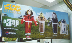 | TACO BELL TACO BELLではアナキン・スカイヲウォーカーのコップをゲット。看板にでかく出ているダース・モールのカップが欲しかったんだが。 「中身はいらん、入れ物だけくれ」と拙い英語で言ってるところ。 そういえば日本にはタコベルの店は無いと思ったが、日本でのキャンペーンはどうなるのか? |