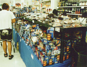 | K-Mart グアムには大きな玩具店がないようで、とりあえずでかいスーパーマーケットK-Martへ、玩具からアパレルまで、店内いたるところにSTARWARSのポップがあって、いろいろな商品を発見。写真はHASBRO社製のフィギュアなんかの販売コーナー。今回のフィギュアはオマケに音声チップが付いていて、専用の再生機を使うと、各キャラの台詞が再生される。しかも、ブリュスターパックというパッケージを開封しなくても、再生機を近づけただけで音声がでる非接触型なんだこれが。パッケージをあけると価値が下がるというコレクターの方への配慮でしょうか? 配慮と言えば公開日。初日を異例の水曜日にして、先にマニアの方々に満喫させてから、週末は家族連れがゆっくり見られるようにしたそうな。 |