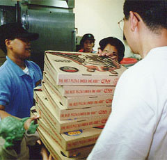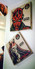 | Pizza Hut Pizza Hutではヨーダのコップをゲット。で、ふとレジ横の壁を見ると、ダースモールとジャージャーの段ボール箱が! そうです、キャンペーン中にピザのTAKE OUTを頼むとこの箱に入ってくるのです。しかし、夕食のあとだったし、さらに1人ピザ2枚食うのはしんどい(ダースモールはLサイズの箱だし)。で、「コレクション用に箱だけくれ」と交渉の結果、1箱$1でゲット。使ってないから油のシミもない。今回の旅で最も安くてカッコ良いおみやげかもしれない。そういえば店の人、この箱の売上はレジ打ってなかったような気がする… | |